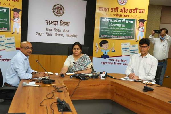 भोपाल : प्रमुख सचिव स्कूल शिक्षा श्रीमति रश्मि अरुण शमी ने राज्य शिक्षा केंद्र सभागृह में सिंगल क्लिक से कक्षा 5वीं और 8वीं का परीक्षा परिणाम घोषित किया। श्रीमति शमी ने परीक्षा में उत्तीर्ण सभी विद्यार्थियों, उनके शिक्षकों और अभिभावकों को बधाई और भविष्य के लिए शुभकामनाएँ दी हैं। कक्षा 5वीं का परीक्षा परिणाम 90.01 प्रतिशत और कक्षा 8वीं का परीक्षा परिणाम 82.35 प्रतिशत रहा है। बारह वर्ष बाद बोर्ड पैटर्न में घोषित दोनों कक्षाओं की उत्तीर्ण सूची में इस वर्ष छात्राएँ, छात्रों की तुलना में आगे रही हैं।