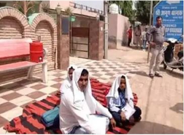 छात्रवृति के लिए बच्चों समेत मंत्री आवास पर धरने पर बैठा पिता