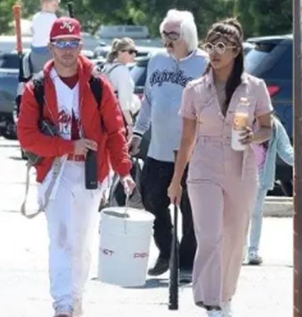 बॉलीवुड एक्ट्रेस प्रियंका चोपड़ा और निक जोनस एक बेहद बिजी लाइफ जीते हैं लेकिन बावजूद इसके ये कपल एक दूसरे के लिए वक्त जरूर निकालता है। हाल ही में जब निक जोनस एक सॉफ्टबॉल गेम खेलने पहुंचे तो प्रियंका चोपड़ा भी उन्हें चीयर करने उनके साथ पहुंची थीं। प्रियंका चोपड़ा ने पिंक कलर का जंपसूट पहना था जो व्हाइट एक्सेसरीज के साथ उन पर बहुत खूबसूरत लग रहा था।फैन पेजों पर प्रियंका चोपड़ा और निक जोनस की ये तस्वीरें वायरल हो रही हैं। तस्वीरों में निक जोनस को व्हाइट यूनिफॉर्म में रेड जैकेट और कैप के साथ देखा जा सकता है। तस्वीरों में प्रियंका चोपड़ा निक के साथ पिंक कलर के जंप सूट में वॉक करती नजर आ रही हैं। प्रियंका चोपड़ा ने हाथों में सफेद रंग का हैंडबैग थाम रखा है और उनके शूज और सनग्लासेज व्हाइट कलर के हैं।