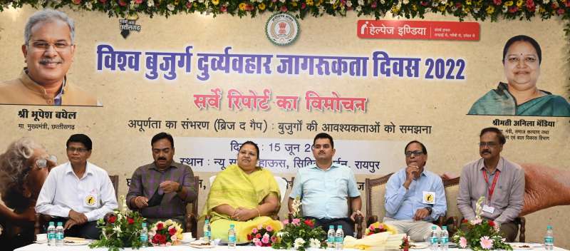 रायपुर : विश्व बुजुर्ग दुर्व्यहार जागरूकता दिवस के अवसर पर समाज कल्याण मंत्री श्रीमती अनिला भेंड़िया ने रायपुर के न्यू सर्किट हाउस में रायपुर सहित देश भर के 22 शहरों में सर्वेक्षण पर आधारित राष्ट्रीय सर्वे रिपोर्ट का विमोचन किया। हेल्प एज इंडिया की इस रिपोर्ट ’अपूर्णता का संभरण- बुजुर्गों की आवश्यकताओं को समझना’ (ब्रिज द गैप-अंडरस्टैंडिंग एल्डर नीड्स) में बुजुर्गों के आय, रोजगार, स्वास्थ्य, सुरक्षा, उनके सामाजिक व डिजिटल समावेशन और उनसे दुर्व्यव्हार पर अध्ययन किया गया है। कार्यक्रम का आयोजन समाज कल्याण विभाग और हेल्प एज इण्डिया द्वारा किया गया।
