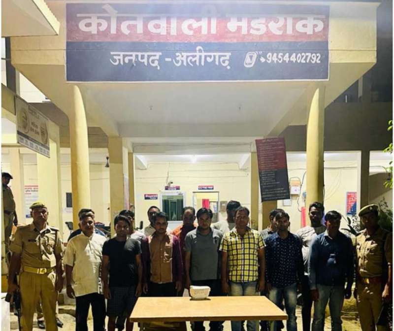 अलीगढ़ । ऑपरेशन प्रहार के तहत थाना मडराक पुलिस टीम ने 14 जुआरी गिरफ्तार कर उनके कब्जे से 1,56,226 रुपये, ताश गड्डी, अवैध असलहा बरामद करने में सफलता हासिल की है। थाना मडराक पुलिस टीम द्वारा मुखबिर की सूचना पर जुआ खेल रहे मुजाहिद पुत्र फरोज निवासी चौडी नाली उस्मान पाडा थाना कोतवाली ,राकेश पुत्र विनोद कुमार निवासी बिहारी नगर थाना सासनीगेट , इरशाद पुत्र नसीम निवासी गभाना थाना गभाना , दिनेश पुत्र रुकमानन्द निवासी ब्रहमपुरी थाना सासनी जनपद हाथरस 5.मोहित पुत्र बालकिशन निवासी पैकबाङा थाना चन्दपा जनपद हाथरस ,.सन्जू खाँ पुत्र हामिद खाँ निवासी लालपुर थाना गभाना ,नजीर पुत्र सफी मौहम्मद निवासी हासिमपुर थाना सासनी जनपद हाथरस ,रामू पुत्र वीरेन्द्र सिंह निवासी अजीत नगर थाना सासनी जनपद हाथरस,राजवीर पुत्र धर्मपाल निवासी पलाहोली चौक थाना सासनीगेट ,अनिल कुमार पुत्र श्रीनिवास निवासी पीपल नगला थाना गौण्डा ,यश वार्ष्णेय पुत्र रतनलाल निवासी डरबर थाना गौण्डा ,चन्दन पुत्र मुकेश निवासी गोवरखुन्डा दुर्गापुरी थाना सासनीगेट,सनी पुत्र काली चरन निवासी बिहारी नगर थाना सासनीगेट ,पप्पी पुत्र महताब निवासी गभाना थाना गभाना को  104 पत्ते ताश,1,56,226 रुपये व दो तमन्चा मय दो जिन्दा कारतूस सहित गिरफ्तार किया है। ।