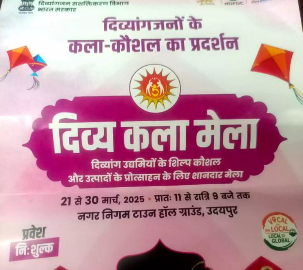 जयपुर । झीलों की नगरी उदयपुर एक ओर अनूठे आयोजन की साक्षी बनने जा रही है। भारत सरकार के विकलांग व्यक्तियों के सशक्तिकरण विभाग (दिव्यांगजन) की ओर से राष्ट्रीय दिव्यांगजन वित्त और विकास निगम का 25वां राष्ट्रीय दिव्य कला मेला 21 से 30 मार्च तक उदयपुर में आयोजित होगा। नगर निगम के टाउन हॉल परिसर में प्रस्तावित इस 10 दिवसीय मेले में देश भर के दिव्यांग उद्यमियों/कारीगरों के उत्पादों और शिल्प कौशल को प्रदर्शित किया जाएगा।