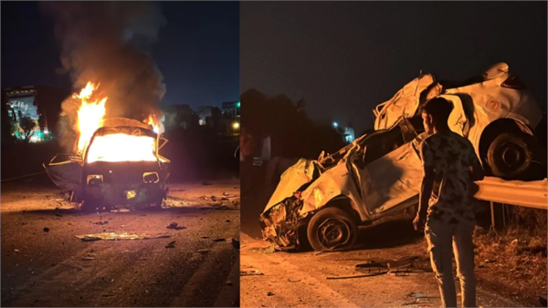 इंदौर-खलघाट हाइवे पर स्विफ्ट और ओमनी कार में हुई आमने सामने की टक्कर, आग लगने के बाद वेन चालक जिंदा जला