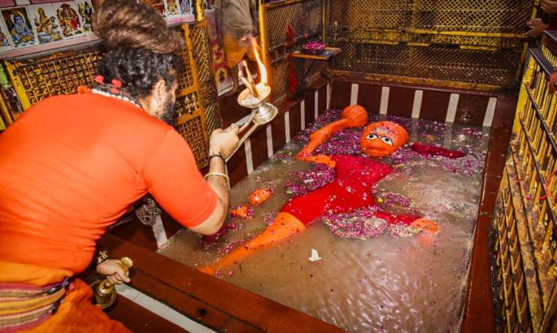 15 जुलाई दिन मंगलवार को दिन में करीब चार बजे पहली बार मां गंगा ने श्री बड़े हनुमान मंदिर में प्रवेश किया था। महंत बलवीर गिरि ने विशेष आरती कर मां गंगा का स्वागत किया। दो दिन बाद जलस्तर घटने के बाद मां गंगा 17 जुलाई बृहस्पतिवार को मंदिर से प्रस्थान कर गईं और साफ-सफाई के बाद मंदिर को श्रद्धालुओं के लिए खोल दिया गया था। कुछ ही घंटे के बाद बृहस्पतिवार की रात को 2.15 बजे जलस्तर बढ़ने के बाद गंगाजी ने पुन: मंदिर में पहुंचकर बजरंग बली को स्नान कराया। बृहस्पतिवार को दिन में मां ने प्रस्थान किया। इस तरह देखा जाए तो श्री बड़े हनुमानजी पहली बार दो दिन और दूसरी बार आठ दिन तक जल शयन में रहे। तीसरी बार नाग पंचमी को तीसरी बार माँ गंगा ने हनुमान जी को स्नान कराया है। महंत बलवीर गिरी ने विधि विधान से मां गंगा और बजरंगबली का पूजन अर्चन किया।