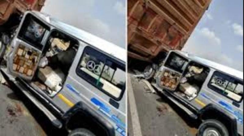 बड़ा हादसा: बच्चों को सुरक्षित बचाने के फेर में चालक ने कार से नियंत्रण खो दिया, जिसके कारण कार सीधे सामने से आ रहे भारी ट्रेलर में जा घुसी।