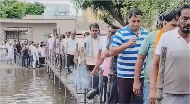 राजस्थान के चूरू जिले में लगातार हो रही बारिश के चलते जगह-जगह जलजमाव की स्थिति पैदा हो गई है. इस कारण लोगों का काफी परेशानियां का भी सामना करना पड़ा रहा है. एक जगह श्मशान घाट के सामने भी पानी भर गया है, जहां से जुगाड़ बनाकर शव यात्रा निकली गई है. श्मशान घाट जाने वाली शव यात्राओं के लिए स्थानीय नेता ने अस्थाई पुल का निर्माण कराया है. जिसके ऊपर चलकर शवयात्रा आराम से निकल पाई.
