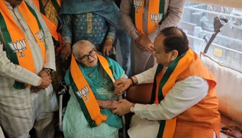 भाजपा के स्थापना दिवस के मौके पर राष्ट्रीय अध्यक्ष जेपी नड्डा ने दिल्ली में पार्टी की वरिष्ठ कार्यकर्ता 98 वर्षीय शकुंतला आर्य से मुलाकात की