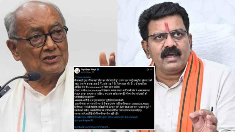कांग्रेस के वरिष्ठ नेता और राज्यसभा सांसद दिग्विजय सिंह ने सोशल मीडिया प्लेटफॉर्म X पर एक पोस्ट किया है. उन्होंने लिखा- ‘मैं नक्सली द्वारा की जा रही हिंसा का घोर विरोधी हूं. उनके साथ कोई समझौता हो कर उन्हें आत्म समर्पण कराया जाता है मैं उसके पक्ष में हूं. विषय कुछ और है. उन्हें सामाजिक आर्थिक रूप से mainstream में लाया जाना चाहिए. देश के सभी Schedule Area विशेष कर बस्तर संभाग आदिवासी क्षेत्र में भारत सरकार PESA कानून लागू करना चाहिए ? बस्तर के खनिज सम्पत्ति में स्थानीय आदिवासी की भागीदारी देना चाहिए ?’