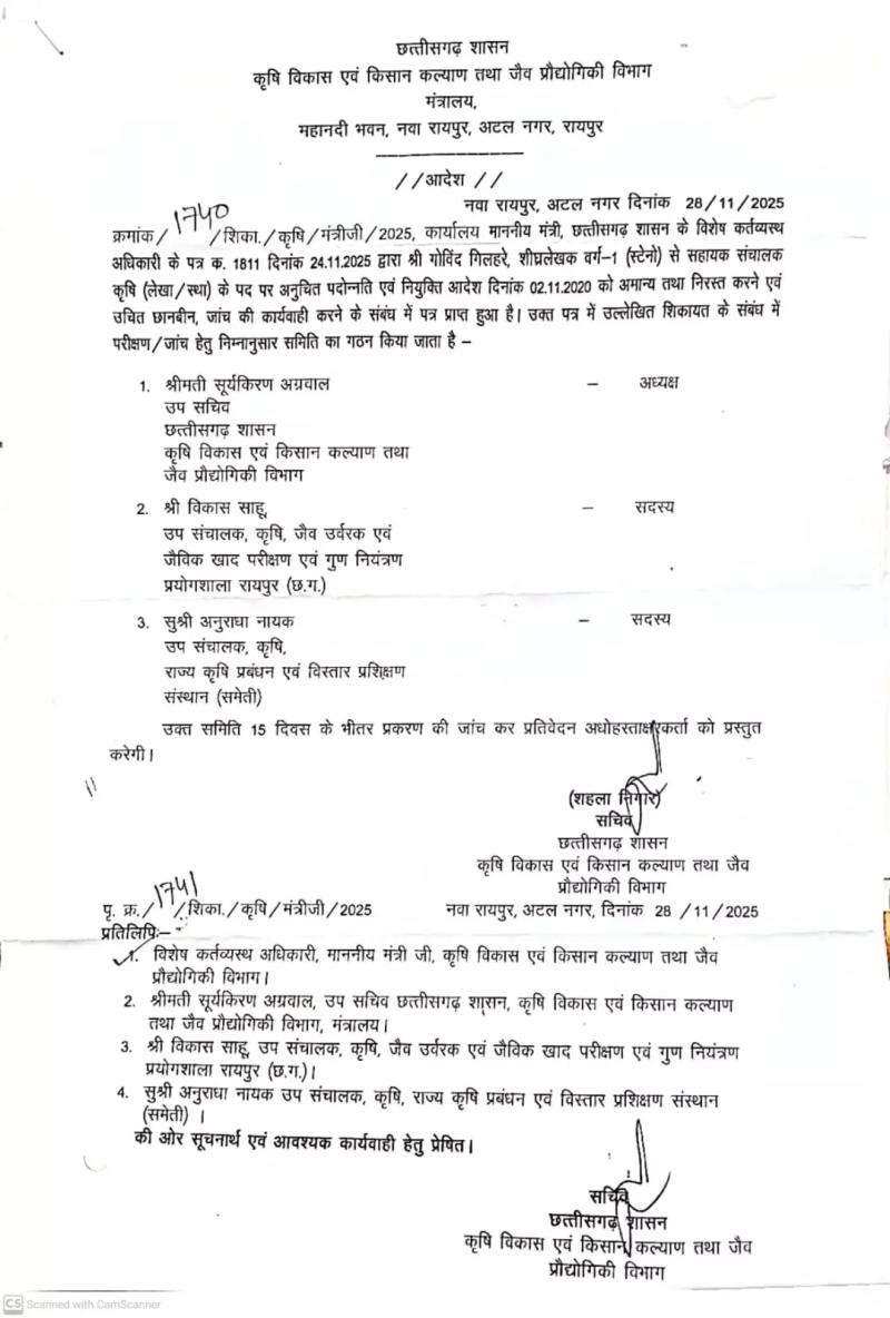 जांच समिति में उप सचिव सूर्यकिरण अग्रवाल को अध्यक्ष बनाया गया है। उनके साथ विकास साहू और अनुराधा नायक सदस्य के रूप में शामिल हैं। यह टीम इस बात की जांच करेगी कि कैसे गोविंद गिलहरे, जो शीघ्रलेखक वर्ग-1 (स्टेनो) के पद पर थे, अचानक नियमों को दरकिनार कर उच्च अधिकारी बनाए गए।