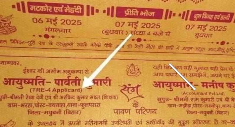जो कार्ड सोशल मीडिया पर वायरल हो रहा है. उसमें देखा जा सकता है कि दुल्हन के नाम के साथ TRE-4 Applicant लिखा है. इसका मतलब ये हुआ कि दुल्हन टीचर बनने की तैयारी कर रही है. वहीं दूल्हे के नाम के साथ ‘Accountant Pvt. Ltd.’ लिखा हुआ है. ये एक कंपनी के नाम लग रहा है. यानी हो सकता है कि दूल्हा किसी कंपनी में काम करता हो.